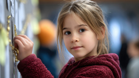 A Scandinavian girl, around 10 years old, smiles confidently as she participates in classroom activities with classmates. The atmosphere is cheerful and vibrant, banner