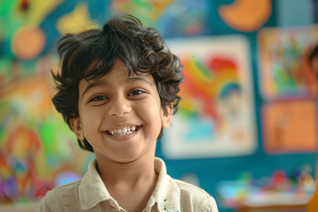 An Indian boy grins happily in an art and creativity class, enjoying the opportunity to unleash his imagination and creativity.