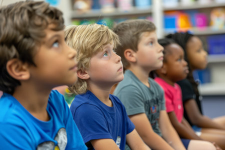 Elementary school students sit attentively, vocalizing vowel sounds with curiosity and concentration, actively participating in their language learning journey.
