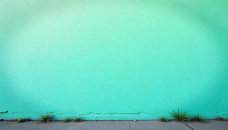 Turquoise wall and sidewalk with small plants at base
