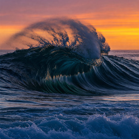 Powerful waves crest and crash under a vibrant sunset, creating a breathtaking view.