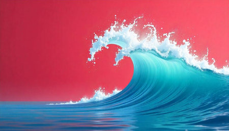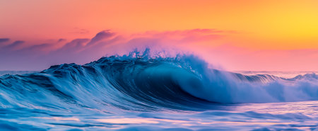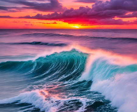 dramatic wave crashing against the shore at sunset, with vibrant colors illuminating the sky and water, capturing the power and beauty of the ocean.