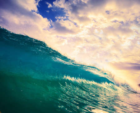 Ocean wave at sunset time. Blue ocean wave with sunbeams