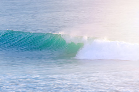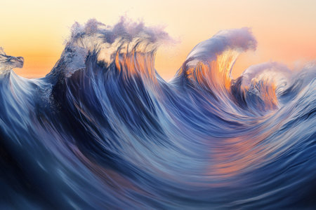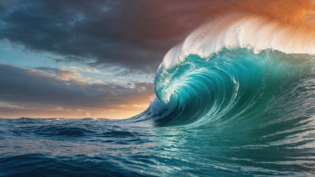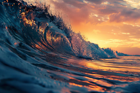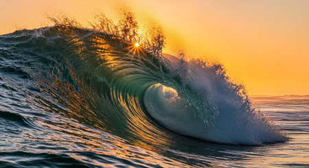 This captivating image showcases an ocean wave during sunrise, with the golden sunlight illuminating the vibrant colors of the water, creating a mesmerizing and tranquil scene that captures the beauty of nature and the power of the sea perfectly, AI generated image