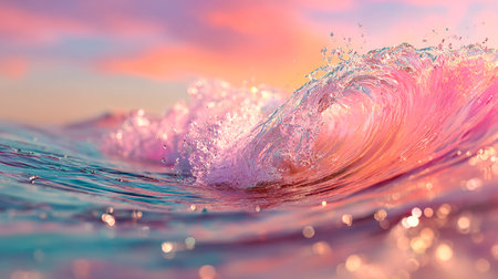 A lively, pastel-hued wave crashes under a soft pink sunset, capturing serene colors and dynamic movement perfect for inspiring ocean and evening scene designs.