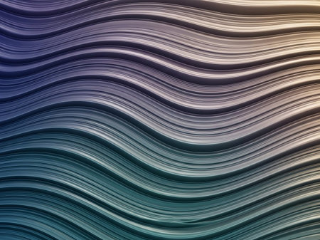 Curved showing abstract flowing wavy lines in gradient shades of blue purple and yellow with subtle light reflections and shadows creating a textured surface keywords: abstract, background,...
