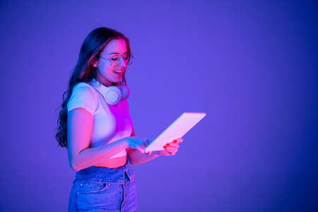 Caucasian womans portrait on blue studio background in multicolored neon light. Beautiful model with headphones, tablet. Concept of human emotions, facial expression, sales, ad, fashion. Copyspace.