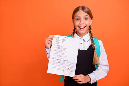 Portrait of her she nice attractive lovely charming cute cheerful cheery successful glad pre-teen blonde girl demonstrating great grade isolated on bright vivid shine orange background
