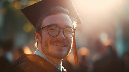 Graduate cap gown tassel sunlight smile glasses portrait outdoor success beams across joyful graduate face under warm sunlight during ceremony
