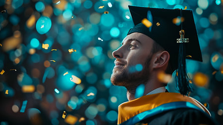proud graduate gay man wearing academic gown and cap, adorned with a rainbow scarf, representing academic achievement and LGBTQ pride, smiling confidently. High quality photo