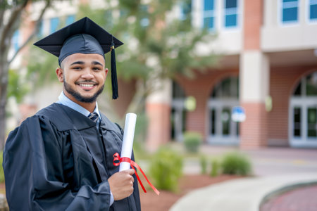 Smiling African American graduate with diploma, standing proudly on campus.