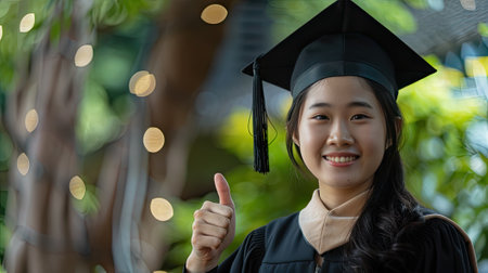 Elegant graduate. Asian charm, thumbs up. Inspire with sophistication