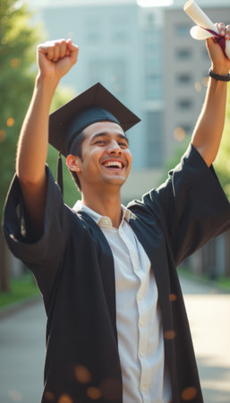 A joyful young graduate raises his fists in triumph, wearing a cap and gown. He is surrounded by fellow graduates, celebrating a significant academic achievement on a sunny day.