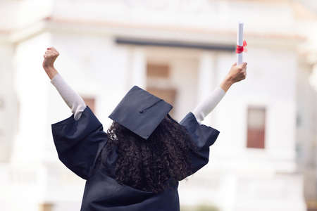The best things happen when you believe you can. Rearview shot of a young woman cheering on graduation day.