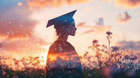 A graduate stands proudly against a backdrop of blooming spring flowers and a glowing sunset sky. The double exposure captures the joy of graduation and the tranquility of nature.