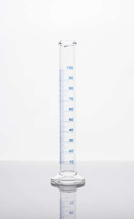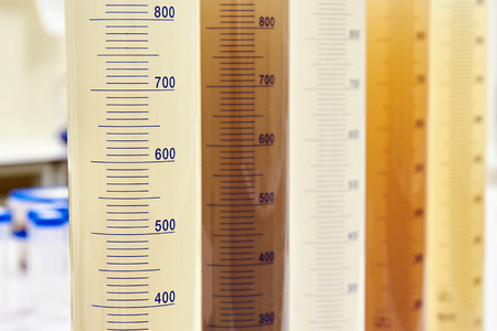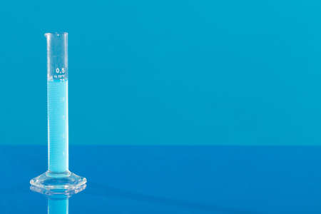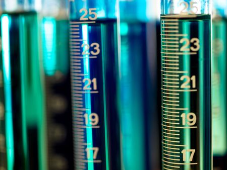 Graduated cylinders in a row in a chemistry/biology lab; Blue monochrome, shallow depth of field.