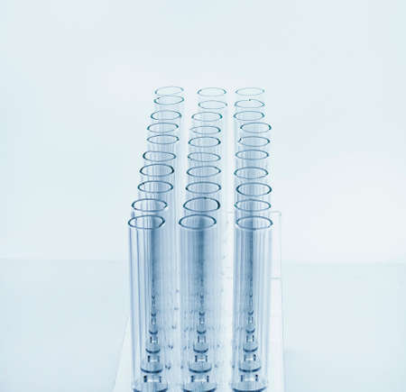 Close-up empty and clean test tubes on white background with copy space. Concept laboratory research and scientific experiment, banner format