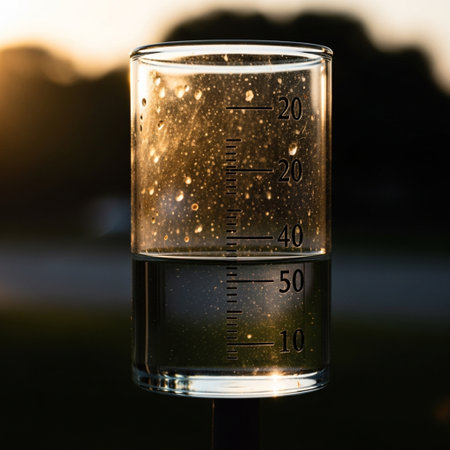 Cinematic side profile silhouette of a clear glass rain gauge outdoors, precisely centered. The meas