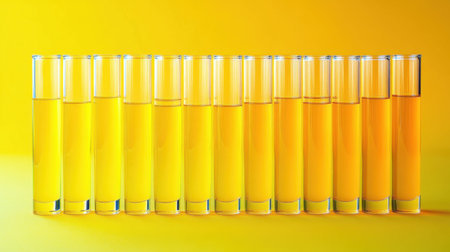 A striking arrangement of clear test tubes filled with a vibrant yellow liquid, set against a matching bright yellow background, ideal for scientific themes.
