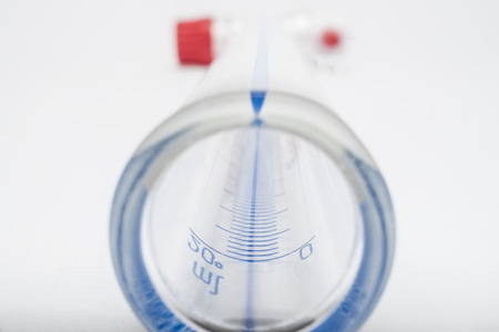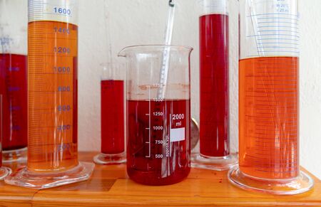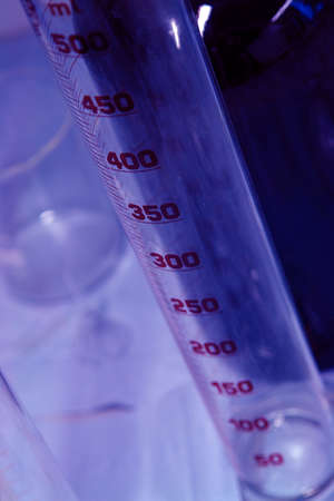Volumetric test tube of great volume (500 mL) with detail of the marks and numbers in red tone. Located on a shelf of a scientific laboratory with another chemical use glassware.