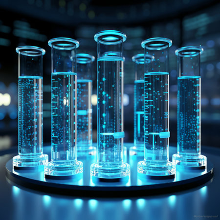 A stunning array of glass vials filled with shimmering liquid creates a captivating scene, illuminated by colorful lights. The interplay of reflections and hues evokes a sense of scientific wonder and creativity, inviting viewers to explore the mysteries of experimentation.