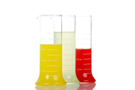 Three test flasks with liquids reflected on white background. Shallow DOF