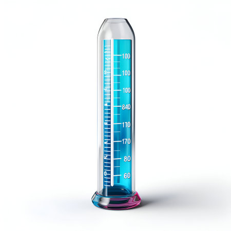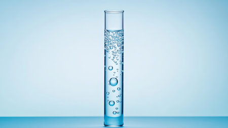 A clear test tube filled with water shows beautiful air bubbles within, set against a soft blue background, ideal for scientific themes and laboratory contexts.