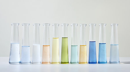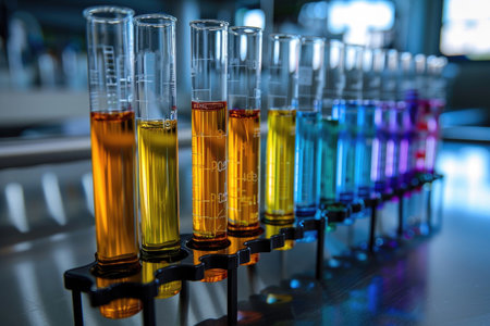 A stunning array of colorful test tubes filled with various liquid solutions, showcasing a vibrant gradient. Perfect for laboratory, science, and educational themes.