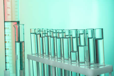 A stand with test tubes on the table near the window of the chemical laboratory. Scientific research activities.
