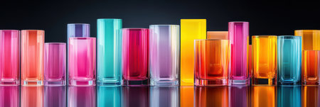 Dynamic composition displays a variety of transparent geometric shapes in electric neon colors. The colors reflect vividly on a glossy black surface creating an eye catching visual effect.