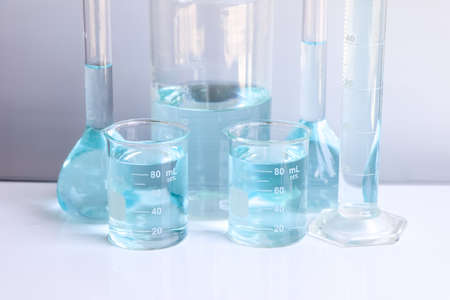 Chemistry laboratory glassware, science laboratory research and development concept, flask, beaker, and test tubes with blue liquid water sample test, scientific test tubes equipment