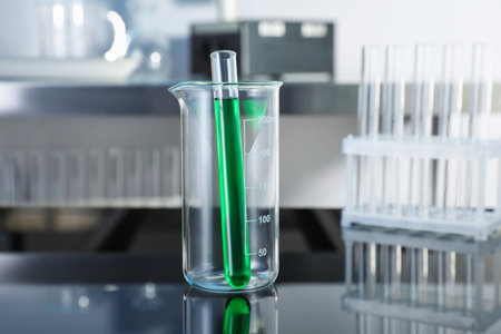 close-up of beakers and test tubes in a science lab, created with generative ai