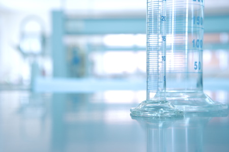 Close up of labware such as beaker, flask, graduated cylinders and test tubes well placed