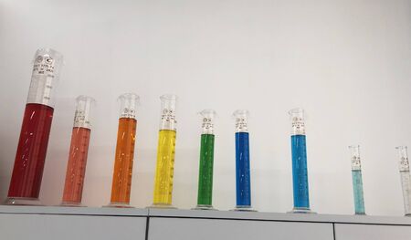 Science laboratory research and development. Modern biochemistry industry mockup. Close up test tubes with color liquid on white background. Chemical manufacture concept with glass equipment.