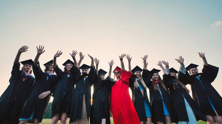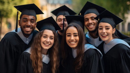 Diverse university students celebrating their academic achievement, sharing happiness, and creating positive memories in a park.