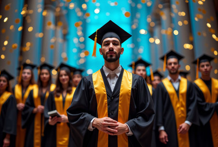 elebratory Graduation Day at Prestigious University, Smiling Graduates in Caps and Gowns.