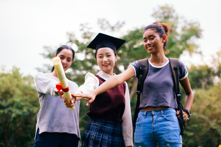 Portrait of a group of students graduation day.Students, hands up or graduation success with diploma paper.smile or happy graduate friends