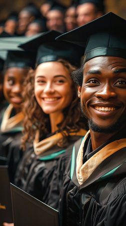 A diverse group of college graduates, wearing cap and gown, celebrate their achievement with bright smiles for the camera. The atmosphere is joyful and proud, filled with happiness and excitement