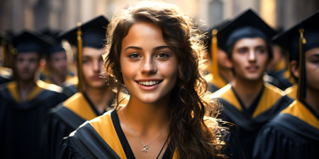 A young female smiling graduate against the background of university graduates. Generative Ai