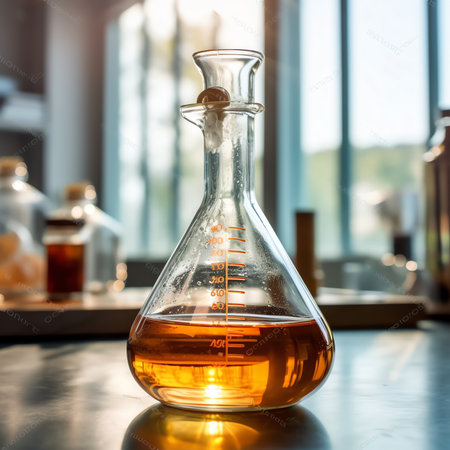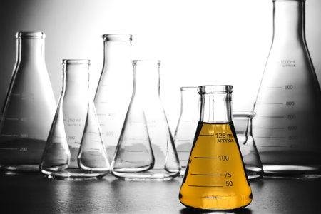 Laboratory glass conical Erlenmeyer flask filled with yellow gasoline gas color liquid for an experiment in a science research lab
