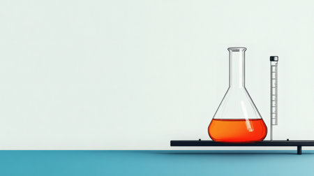 An erlenmeyer flask filled with an orange liquid sits next to a graduated cylinder. Both are resting on a black stand. The lab backdrop is white above a blue base.