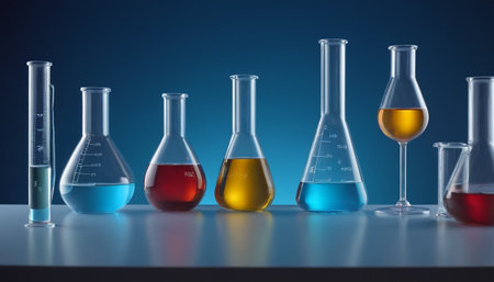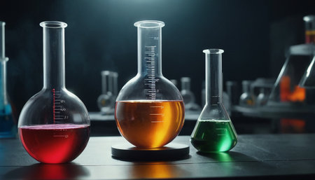 Colorful liquids filling volumetric flasks on a laboratory bench, symbolizing science, research, and chemical experiments