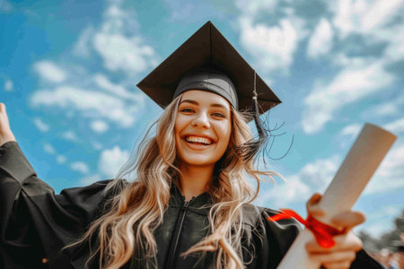 Happy woman in mortarboard holding diploma and smiling during graduation ceremony : Generative AI