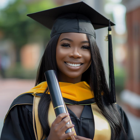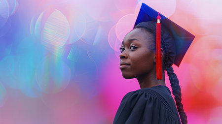 African-American Female Graduate in Cap and Gown Against Vibrant Background