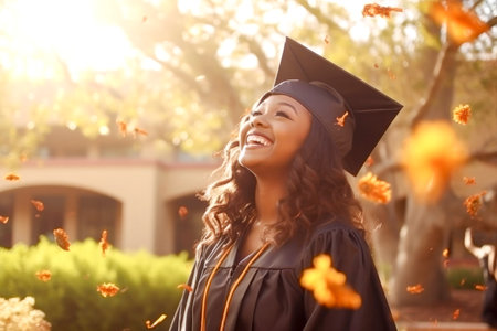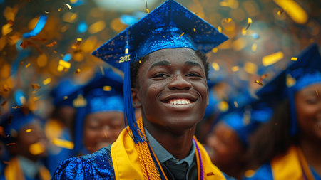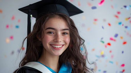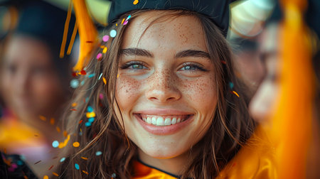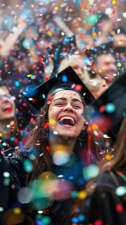 A Graduation celebrations bring joy and excitement as young woman smiles brightly amidst colorful confetti
