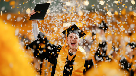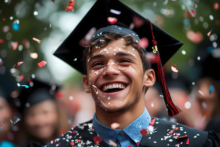 Joyful graduate celebrates their achievements with colorful confetti, sharing pride and happiness with family and friends during this special moment.