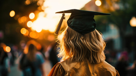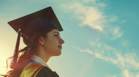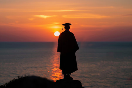 Serene graduate in cap and gown at sunset, feeling of achievement and hope.