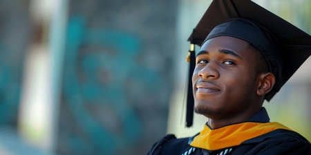 portrait of a happy university graduate in a gown and academic cap. The atmosphere of joy from graduation