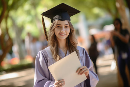 Focused female graduate holding diploma, fellow graduates blurred in background.