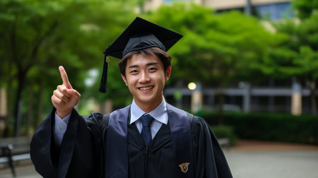 Portrait of a young asian student girl in graduation gown and cap showing victory sign